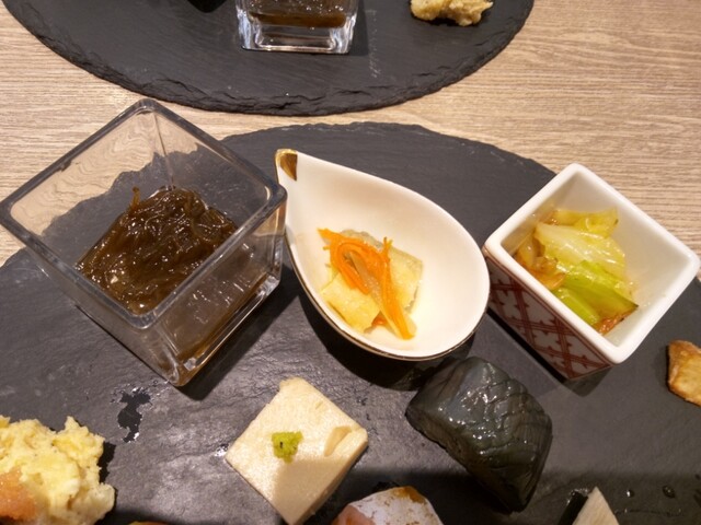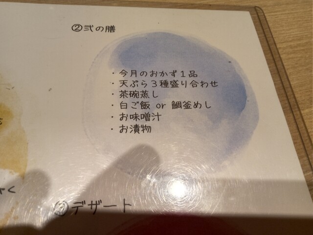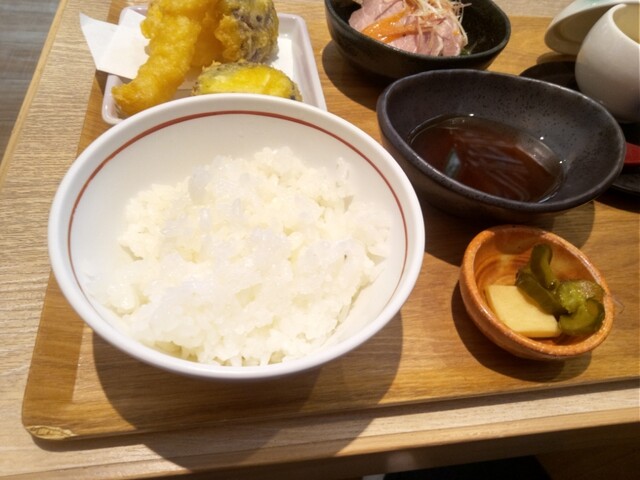 天ぷら、焚き物、茶碗蒸し、ご飯、佃煮、味噌汁。