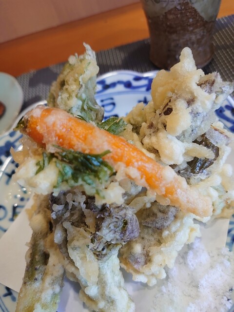季節の天ぷら盛合せは、春野菜の天ぷらでした。グリーンアスパラ、タラの芽、ふきの天ぷらを塩でいただきました。