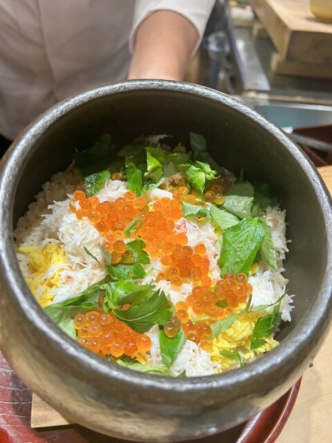 いくらとカニがたくさん入った幸せ土鍋ご飯。