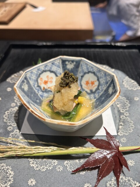 ▫先付 蒸し鮑とほれん草 リンゴ酢掛け