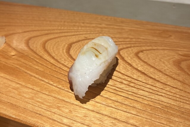 一貫目、早速一口…美味しい‼︎ 味は白身魚らしくさっぱりしていますが、旨味と甘味が豊かです!