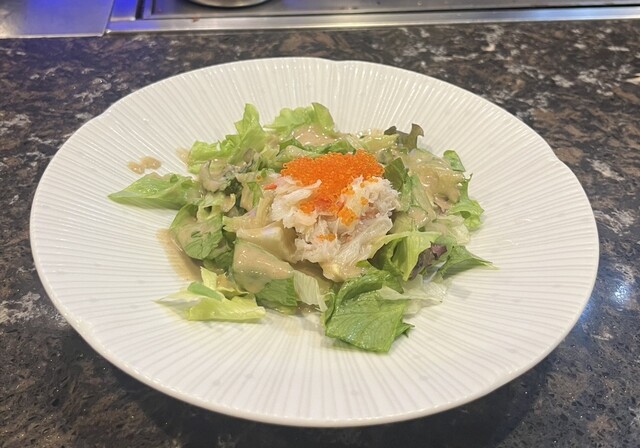 ズワイガニと蟹味噌のドレッシング、とびっこがアクセントとなる一品。特にドレッシングが美味しい…‼︎