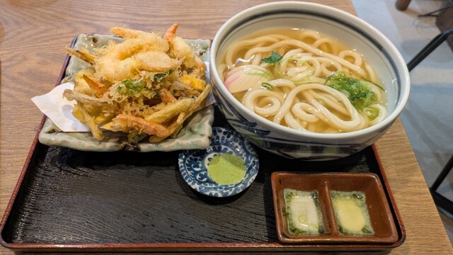 私はかき揚げとうどんのセットを注文。揚げたてサクサクのかき揚げは、野菜やエビなどぎゅっと詰まっていて、大きくてボリュームがあり抹茶塩でいただきました。