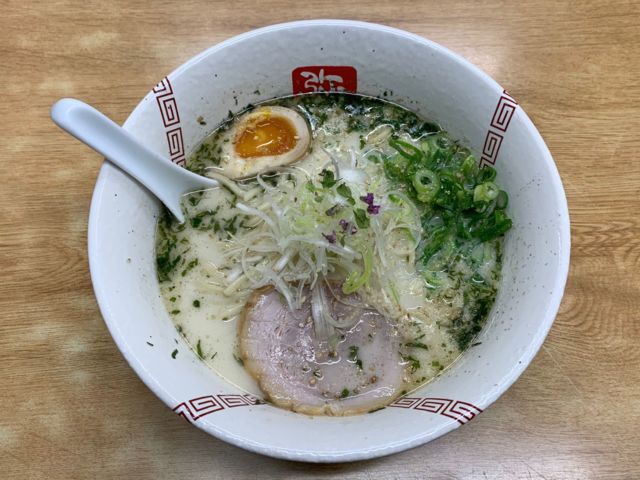 塩らーめん、鶏白湯ベースのスープに塩タレが効いたスープ。どんぶりの底には小エビなどが沈んでおり魚介の旨味も感じられ、更に紫蘇の葉が浮いており、クリーミーな口当たりにふくよかな旨味。中くらいのストレート気味の麺、ぷりっとしたもちもちの食感。スープとの絡みが抜群。具はチャーシュー、味玉、2種類のネギなど。