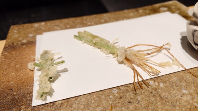 せり(葉っぱは右にある鰹出汁に入れて吸い物にしてお口直しに、根っこは塩で)