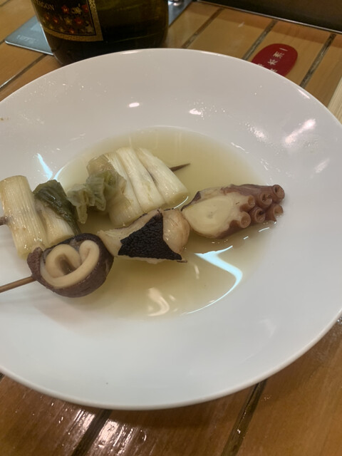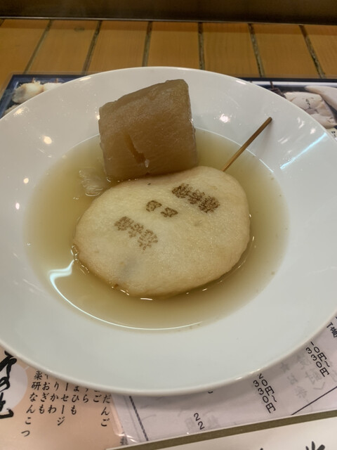 まず出汁は魚介系風味の出汁であっさり余計なものが入ってない自然な味わいな感じで無茶苦茶うまい、これにタコや練り物、大根に丸天を出汁と絡めて食べた。色々と煮崩れすぎてないちょうどいい皆が歯ごたえがある。優しくこれぞ素材を100パー生かしたものたちだと感じました。感服しました。ナスは味噌につけて食べました。味噌は濃ゆい奥深い味でこれはこれで少し食べる分には美味い。