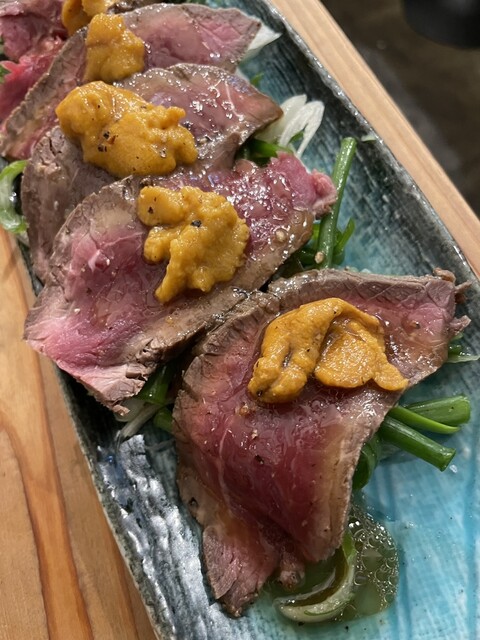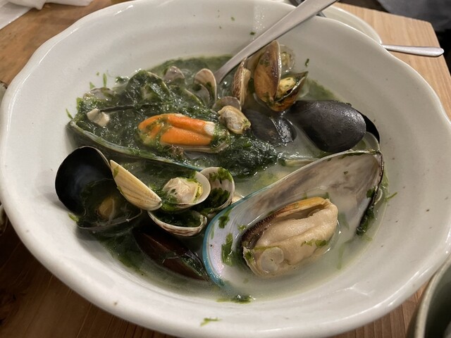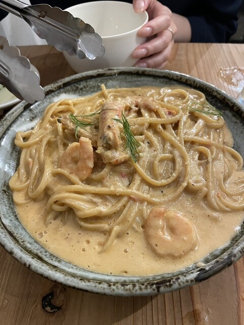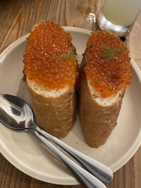 いくらのせ発酵バタートースト、牛のウニのせタリアータ、せせりのバター焼き、しらすと青のりのアヒージョ、そして最後に海老のビスククリームパスタを食べました。