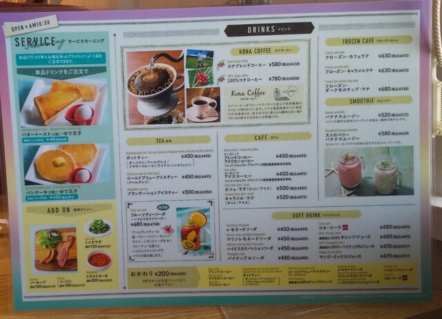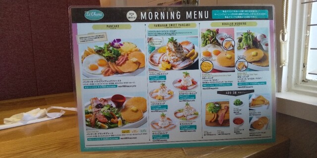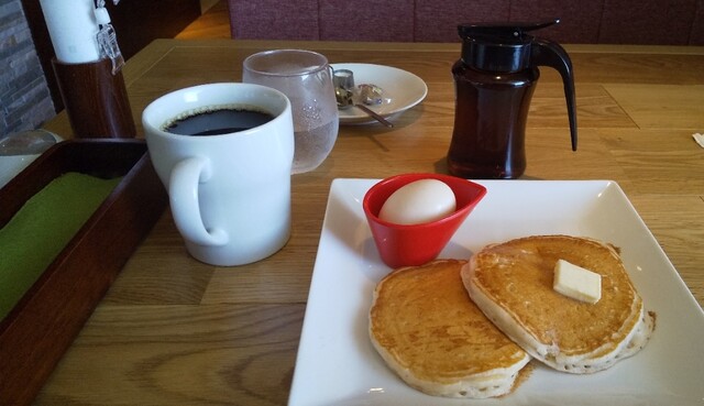 モーニングは、ドリンクを注文するとトーストとゆで卵が無料でついてくる、パンケーキは+50円