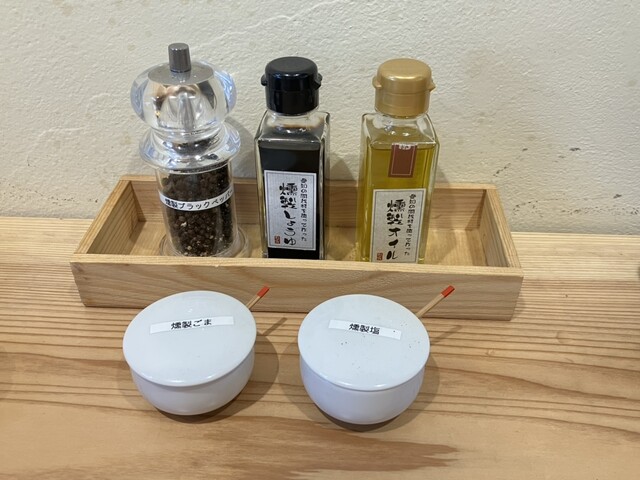 テーブルの上には醤油、塩、コショウ、オリーブオイル、ごまの燻されたもの。小さい瓦の箸置きがセットされていました。