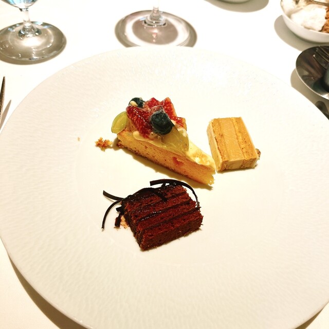 デザートはもちろんワゴンサービス好きな物を好きなだけ✨全て説明して頂きましたがその中から3種類を盛り合わせにして頂きました。チョコレートケーキとフルーツが乗ったタルトと、キャラメル系。それとさっぱりしたアロエのジュレを別添えで。