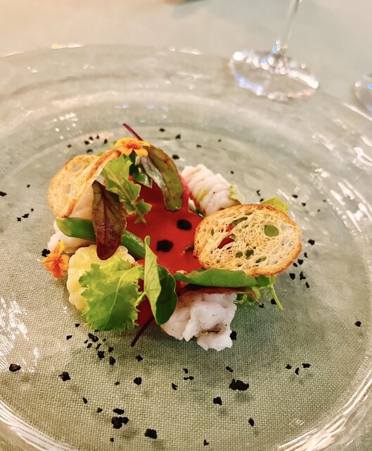 このひと皿に何種類の野菜が使われているのでしょう、彩りと味が比例されていてお皿の周りの黒い粉はトリュフ✨鱧が本当に口当たりが優しく小骨は何も感じない美味しさでした。