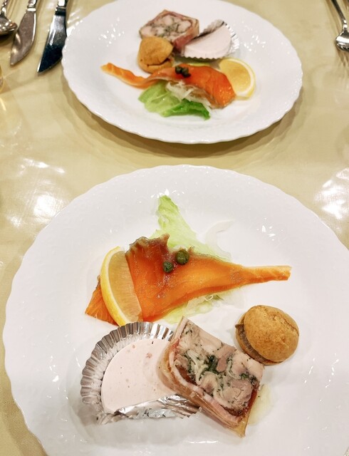 オードブルも正統派のメニュー✨スモークサーモンと肉厚のポークのテリーヌそれに薄切りのソーセージに、多分豚肉のリエットが挟まれたミニシュー、ちゃんとレモンも添えられていました✨( ‘-^ )