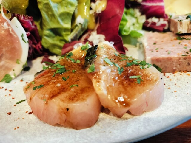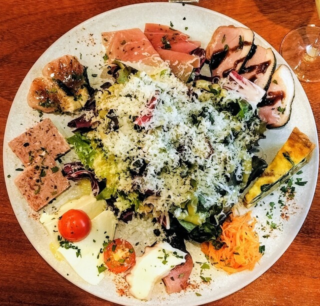 燻製鴨ロースバルサミコソース、マッシュポテト添え、ほうれん草のキッシュ、クミンの効いたアロマレッドのキャロットラペ、京都の美味しい豆腐、パテドカンパーニュ、ブリのマリネ、生ハム