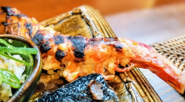 素揚げにしてあるので頭からバリバリ食べられ炭の香りと炙られた味噌の香り、海老のプリプリした食感は秀逸!