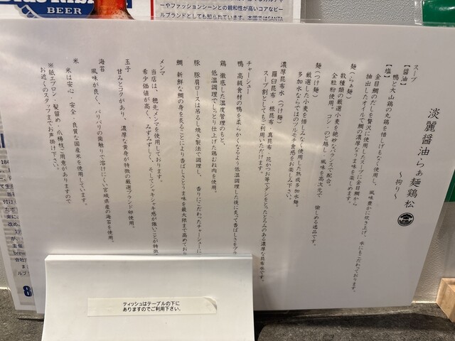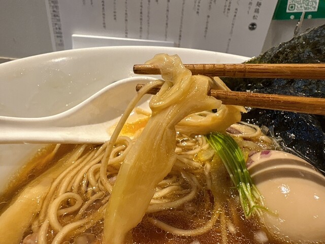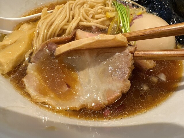 小田原へ友人に会いに行った際に友人のアテンドで訪麺。エリアナンバー1の人気と聞いて並ぶのを心して行きましたが時間が遅くてスムーズに入れました。せっかくなので特製醤油らぁ麺(1,350円)をオーダー。鶏と鴨の出汁が見た目以上に色濃く出ているスープ。蕎麦のようなコシがある麺が適度な茹で加減で提供され、これらに拍車をかけるのが鴨チャーシュー。主張し過ぎない絶妙なバランスで気付けば食べ終わってしまいました。拘りの強い「らぁ麺」のジャンルの中でも間違いなく上位です。