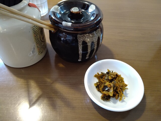 トッピングにもやしはマスト、テーブルのめっちゃ辛い高菜と合わせるとうまい!スープとからめてもナイス!