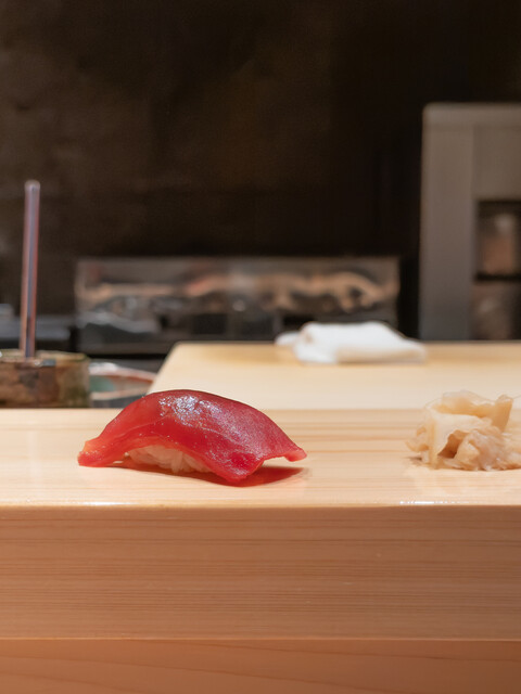 平日20時30分の二巡目で入店。カウンターは八割ほどの入りで、静けさの中に適度な緊張感が漂う。白木の台に一貫ずつ置かれるたび、店内の空気がすっと澄むのが心地よい。室温はやや低めに感じられ、寒いという声に私も部分的に同意した。