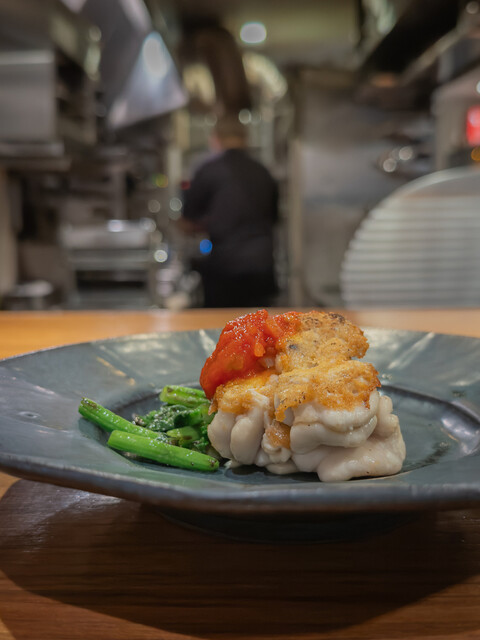 個人的な白眉は鯛のたらこ。低温域を正確に止めた火入れで、身はしっとり、たらこの旨味はふわりと全体に行き渡る。合わせた季節野菜も食感と温度が揃い、皿としての完成度が高い一品でした。続く生馬肉タルタルは、香味のレイヤーとテクスチャが巧みで、赤系のグラスが肉の甘みをすっと引き出します。