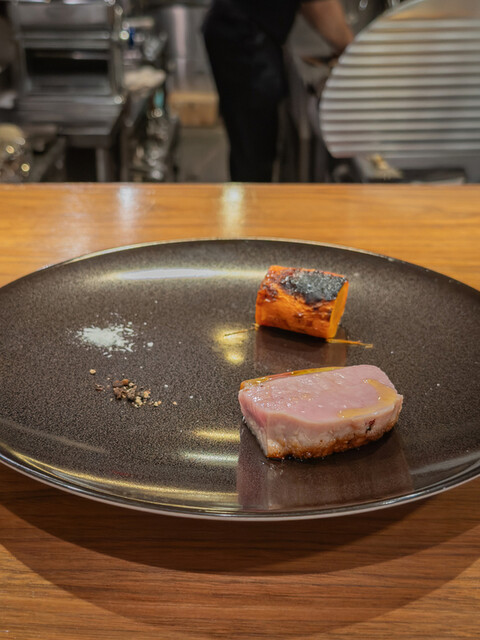 コースは《ペアリング付》シェフのおまかせ(22,000円)。冒頭のシャンパーニュに続き、名物の生ハム+バターのブリオッシュ。塩味と乳脂のコントラストが立ち、グラスの酸で軽やかに切れる構成。以降も一皿ごとに味の重心と香りのボリュームが段階的に上がり、ペアリングの設計が明快でした。