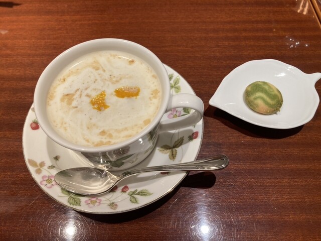 シナモンミルクティー(825円)※パッと見、コーンポタージュ…ではないですよ!オレンジスライスが2カケラ