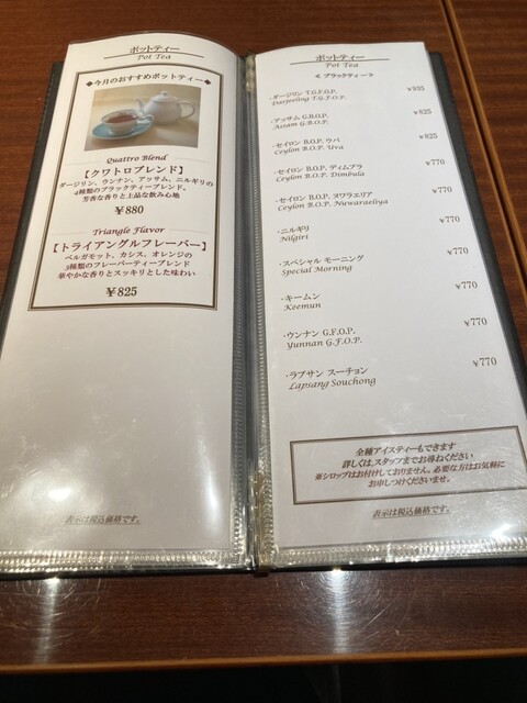 隠れ家のはずなのに、人気で待ち状態。待つ価値ありです。日曜日なので特に混んでいるのかな…。頂いたのは、トライアングルフレーバーティー(¥852)。こちらの紅茶をポットで頂きました。その名の通り3種類のリーフでの構成。