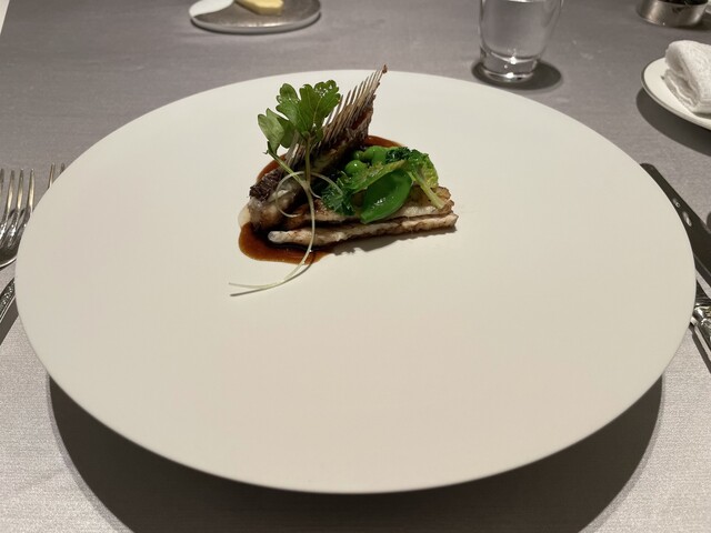 平スズキ&春野菜 ポワレにし、春野菜のミルフィーユ ソースベルジュ