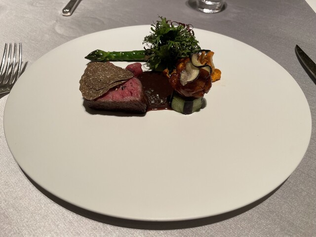 黒毛和牛&グリーンアスパラガス 低音調理しロースト、リ・ド・ヴォーのキャラメリゼ トリュフのクルートを纏ったグリーンアスパラガス