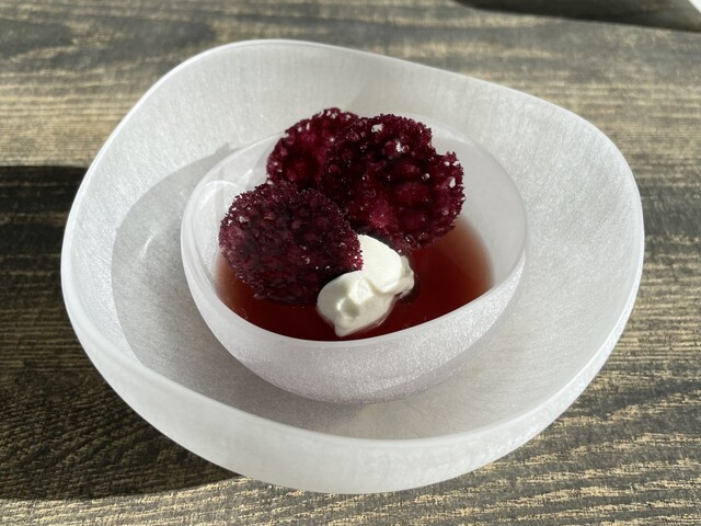 見た目は華やかで、モダンなフレンチの装いですが、山菜のオイルやジビエのコンソメを使ったソースは深い味わいがありました。また、薪焼きの火入れは絶妙です。アクセスはとても悪いですが、一度はわざわざ足を運ぶ価値のあるレストランだと思います。