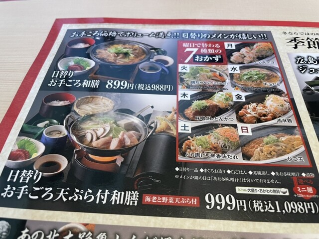 メインが選べたり、お味噌汁を麺類に変更できます。