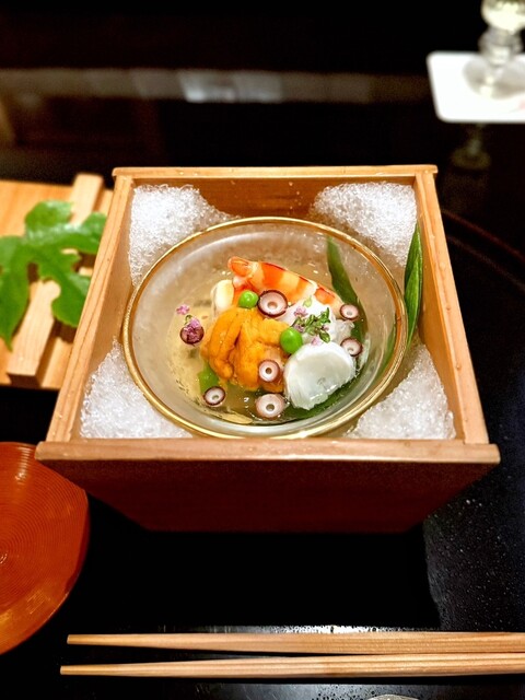 夏タコ・雲丹・天然車海老・梅の煮凝り。タコの吸盤を水玉模様にあしらい