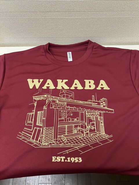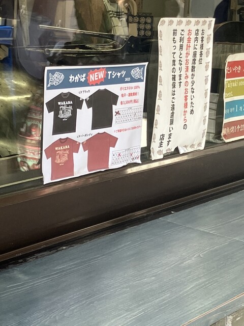ヌヌッ!『わかばNEW Tシャツ』なる貼り紙が! わかばさんの建物が全面にデッサンされ袖にはたいやきが描かれたマニア垂涎モノです。