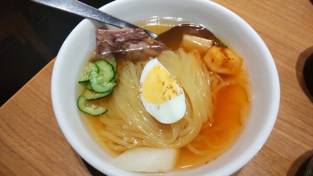 さっそく焼きます程よい脂が乗りあっと言うまに完食、次は冷麺、太麺ややモチモチスープは割りと甘いが、焼肉の後にサイズもハーフは丁度良い。
