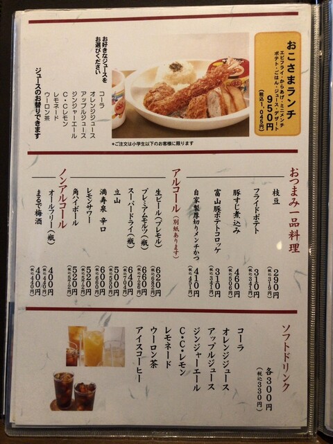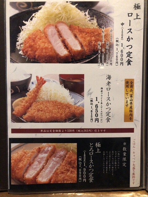 メニューは、富山の食材にこだわったロースかつなどが並んでいます。今回はランチメニューからロースかつランチを選択しました。ロースかつにライス、味噌汁、漬物、ドリンクが付いてきます。