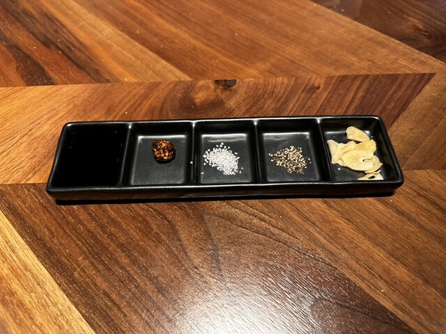 お肉は+2,200円でフィレに変更しました。とても良いサシが入っていて、口に入れると溶けてしまうほど柔らかかったです。レアで焼いてくださり、火入れもちょうど良かったです。味付けに塩・胡椒だけでなく、醤油、ラー油っぽいお味噌やにんにくチップがついていました。このラー油系のお味噌がとっても美味しかったです。お肉にしっかり良い脂がのっているので、(普段は塩派なのですが)醤油などでいただくのが合いました。