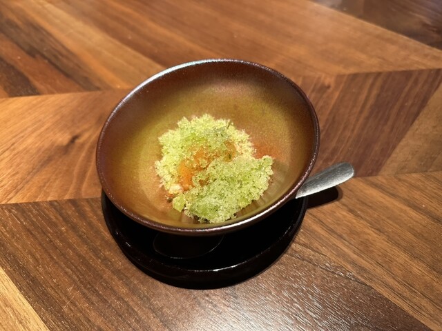 とにかく雲丹がガツンと来たので、その後お肉の前にお口直しを挟むのはありがたかったです。柿が入っていて甘さもあり、さっぱりしました。