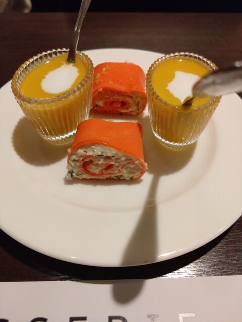 前菜 温かいかぼちゃのスープとおなじみサラダクレープ(ピンク!)