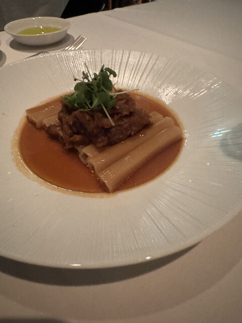 はまちのタリアータ エスカロール タンジェリンスカモルツァクリーム 松の実とオリーブ:程よく脂ののったはまちに、柑橘の爽やかな酸味とスカモルツァの香ばしいコクが重なり、軽やかで奥行きのある一皿。松の実とオリーブが食感と塩気のアクセントとなり、バランスが絶妙でした。