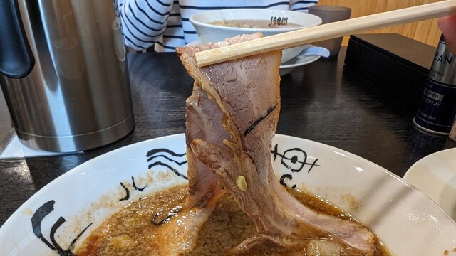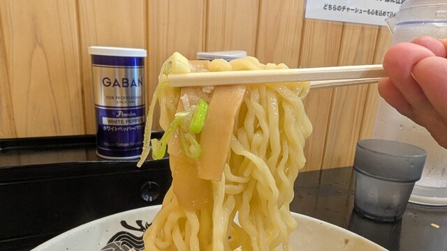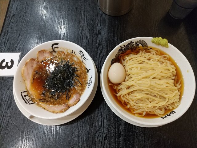 はせ川のつけ麺、美味しかったです。期間限定のつけ麺は毎年バージョンアップされますが、今期は過去最強バージョンです。通常のつけ麺は水で〆られた後、皿や丼に汁無しで盛られますが、はせ川のつけ麺は、冷水で〆られた中太麺が昆布醤油の出汁の中にをひたひたに浸され、わさび付きでの登場となります。麺はツルツル感マックスのやや細めの中太麺とさらに細めの麺が使用されており、2種類の太さでの提供です。この太さの違う麺がつけ汁との絡みを増し、麺とつけ汁の美味しさを最大限に堪能できる最高の組み合わせです。この麺、並盛りで2玉340g、大盛りは3玉510gのため、並盛りでも大満足です。つけ汁はその日の気温等で味を調整をしており、やや控えめの酸味が食欲をかき立てます。つけ汁は、はせ川自慢の超ロングチャーシューが2枚と背脂、メンマ、タマネギ、コロコロチャーシューがタップリで、心もお腹も大満足です。最初は、つけ汁ではなくわさびと昆布出汁で麺の旨味を堪能し、その後パンチのあるつけ汁との中太麺の絡みを楽しみ、最後はわりスープで鶏と魚介の奥深いスープの美味しさを楽しむ。はせ川の最強つけ麺、おすすめです。