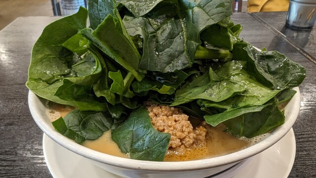はせ川の期間限定メニュー、会津産極寒ほうれん草の濃厚胡麻みそらーめん、美味しかったです!会津産極寒ほうれん草は、冬の間、あえてほうれん草の上に雪を積もらせ、ほうれん草を極限まで甘くした逸品です。極寒ほうれん草は、葉は肉厚で、茎も柔らかく甘みもバツグンです。いわゆる「えぐみ」もなく、スープに浸すことで柔らかくなり濃厚胡麻味噌スープとの相性が最高です。スープは丸鶏ベースですが、鶏の旨味と、胡麻と味噌の風味との相乗効果で、極上の味噌スープとなります。麺は東京製麺のはせ川オリジナルの中太麺で、モチモチ感とツルツル感がマックスです。今年は暖冬で極寒ほうれん草の出荷量が少ないため、提供期間が短いようです。ぜひ、会津産極寒ほうれん草の濃厚胡麻みそらーめん、食べてみてください。おすすめです。