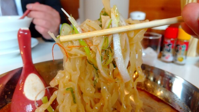 満喜の火華(ひばな)、美味しかったです。以前より辛さが刺激的になりました。スープは豚骨ベースの塩スープで辛味噌入りになります。かすかにニンニクの風味も加わりとても美味しいです。食べ進めると刺激的な辛味と出汁の旨さがベストマッチです。チャーシューも厚みのある炙りチャーシューで、味付けもスープの味を引き立てる逸品です。麺は朝日屋食品の中太麺で、ツルツル感とモチモチ感が最高です。中太麺の小麦の甘さと激辛スープのバランスが最高で箸が止まりません。ラーメンの盛り付けもとても綺麗です。券売機で食券を購入するため 、ネットで事前にメニューを調べておくと、混雑時も慌てなくてすみます。火華は現在、白い陶器製のドンブリでの提供となります。暑い夏に食べる刺激的な辛さの火華(ひばな)、おすすめです。