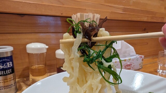 満喜の塩ラーメン、美味しかったです。スープはかすかに甘味を感じる豚骨ベースのスープです。塩ラーメンのスープは透明で、麺をすするとカツオらしい風味が余韻として口の中に残ります。塩ラーメンには以前は乾燥エノキが入っていましたが、キクラゲに変わりました。チャーシューは厚みのある炙りチャーシューで、味付けもスープの味を引き立てる逸品です。麺は塩ラーメンは朝日屋食品の中太麺で、ツルツル感とモチモチ感が最高です。ラーメンの盛り付けもとても綺麗です。「満喜」さんの店主は「喜一」さんの息子さんです。「喜一」で修行し、お店を新しく構えました。「喜一」さんのベースを継承しながらも、のれんにもある「我流」を貫く店主の心意気に感激です。おすすめです。