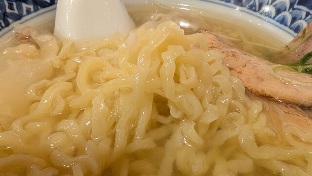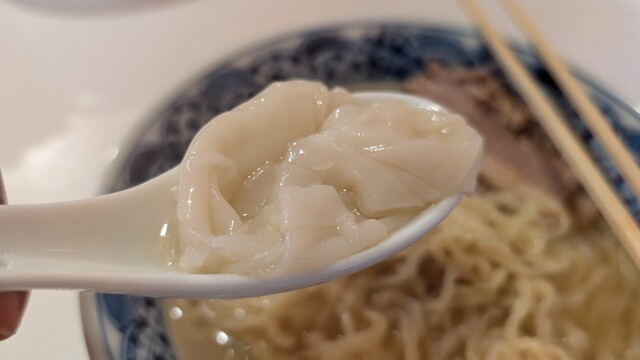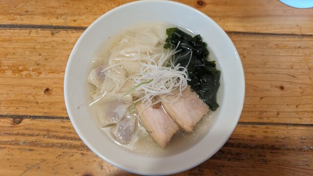 満喜の塩ワンタン麺、美味しかったです。進化が止まりません!!暖簾にある「我流」の文字の真骨頂です。スープはかすかに甘味を感じる豚骨ベースの透明スープです。余韻として鶏ガラの旨味とカツオらしい風味が口の中に残ります。塩味ですが、かすかに甘みを感じる絶妙な塩スープは、お父さんである「喜一」さん譲りの素晴らしい絶品スープです。ワンタンはツルツルの食感が最高で、かすかなショウガの風味が塩スープの美味しさを聞き立てます。ワンタンはとろける食感も良いですが、あえて噛み応えを少し残した満喜さんスタイルのワンタンが個人的にはおすすめです。チャーシューは厚みのあるトロトロチャーシューで、肉本来の旨味が堪能できます。麺は朝日屋食品の平打ち中太麺でツルツル感とモチモチ感がマックスです。醤油ワンタン麺のみが曽我製麺製で、ラーメンの種類によって麺を使い分ける店主のこだわりです。ラーメンの盛り付けも変化し、毎回とても綺麗です。店主のアイデアとこだわりがラーメンに生かされています。ますます進化する我流のラーメン「満喜」、おすすめです。