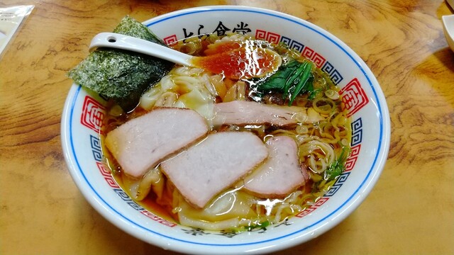 とら食堂のワンタン麺大盛、チャーシューおにぎり、美味しかったです。スープは豚骨と鶏ガラと丸鶏ベースで、やや醤油を強めに感じる化学調味料を感じない素晴らしいスープです。麺は自家製手打ちのやや細目の中太麺で、ツルツル感が最高です。麺がやや長めで、麺をすすると、鶏と醤油の香りが鼻を突き抜けます。チャーシューは燻製されたモモ肉で、噛むごとに肉の旨味が口の中に広がります。ラーメンが提供される前に刻みタマネギがテーブルに運ばれてきます。途中で刻みタマネギを加えるとタマネギの甘みがスープと麺の美味しさを引き立てます。チャーシューおにぎりもスープとバッチリ合う美味しいおにぎりです。福島県内でもトップレベルの人気店で、県外からのお客さんでいっぱいです。名前を書く紙などはなく、玄関先で1グループごとに1枚の整理券が発券され、番号が呼ばれるシステムです。決して駐車場に車を止めて、行列の最後尾に並ばないでください。駐車場にはトイレもあります。店員さんも多忙にもかかわらず笑顔の対応で、頭がさがります。福島県内トップレベルの人気店で、とら系の総本山とら食堂、おすすめです。