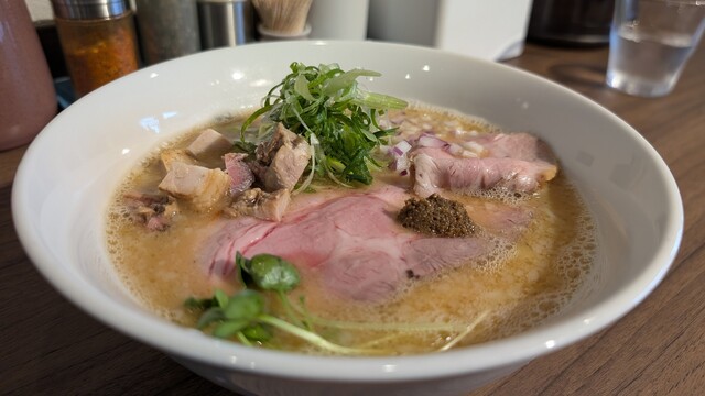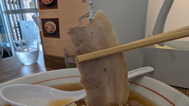 Là Là Gottsuo(ララゴッツォ)の喜多方ラーメン、きざみチャーシュートッピング、美味しかったです。喜多方期待の新店です。お店の場所は以前「香福」さんがあった場所で、令和7年4月20日にオープンしました。喜多方ラーメンのスープは鶏ガラと豚骨ベースのすっきりしたクリアな味わいで、かつ旨味のしっかり効いた飽きのこない味です。余韻としてかすかな煮干しと芳醇な醤油の風味、昆布の旨味が口の中ふわ~っと広がります。麺は地元喜多方市の製麺所である曽我製麺製で、喜多方市内ではやや太めの多加水中太麺です。曽我製麺特有のモチモチ感マックスでの提供となります。この麺とスープがベストマッチです。チャーシューは噛むと醤油ベースの下味が口の中に広がり、脂身は口の中でとろけ、赤身はふわほろと噛まなくてもほろりとほどけ、旨味がスープの味を引き立てる逸品です。 途中で別皿で提供されるきざみチャーシューを投入すると、ブラックペッパーをまとったきざみチャーシューの脂身とスープの旨味との相乗効果でバツグンの美味しさになります。素材の何かが突出しているわけでなく、全体としてのまとまりがバツグンで、お店を出た後でも美味しさがしっかりと脳に焼き付けられるラーメンです。Là Là Gottsuo(ララゴッツォ)の喜多方ラーメン、おすすめです。