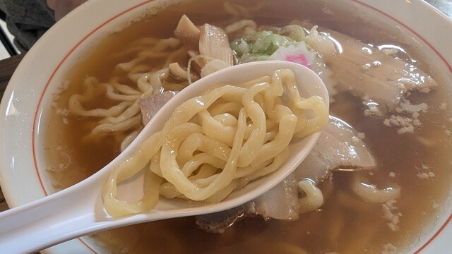 麺は地元・喜多方の曽我製麺製の多加水中太麺。喜多方市内の標準よりやや太めの番手で、曽我製麺特有の高い加水率によるモチモチとした弾力が最大限に発揮されています。スープとの絡みも申し分なく、清湯スープに適度な持ち上げ感を与え、完成度の高いマッチングを実現しています。