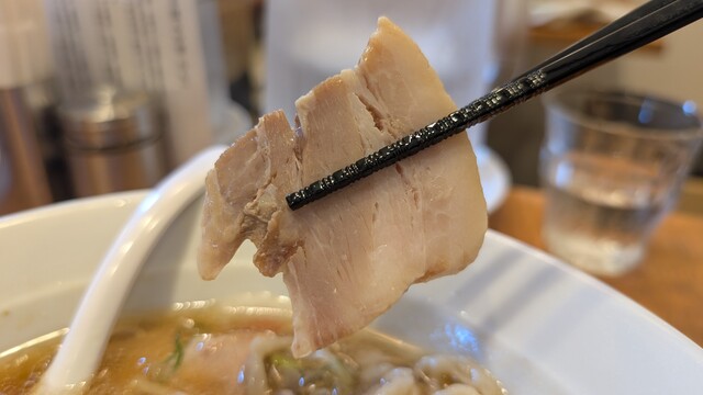 純手揉み中華 れん のこってり中華そば、美味しかったです。令和7年7月24日に喜多方にオープンした新店です。こってり中華そばは、東京のガッツリ系で流行っている味付きの背脂「ブタカスアブラ」が追加されます。スープは最初に煮干しがふんわり香り、丸鶏特有のふくよかな旨味をガツンと感じます。余韻として豚骨の旨味が口の中に広がる絶品スープです。そこに「ブタカスアブラ」のまろやかな甘みが加わり、素材の本来の旨味が寄せては返す波のようにダイレクトに幾重にも感じられます。旨味の凝縮した繊細ながらも分厚いスープに驚愕です。麺は福島市の製麺所である羽田製麺に多加水太ちぢれ麺で、麺をゆでる前に丁寧に手揉みを加えることで、麺の太さがランダムになり麺をすするたびに違う食感が味わえます。しかも、コシが強く麺の噛み応えがバツグンで、このような食感の麺に出会ったことがありません。麺の長さも普通より長めですすりがいがあり、麺をすすると醤油の芳醇な香りが鼻を突き抜ける逸品です。チャーシューはトロトロ系で脂身は口の中でとろけ、噛むごとに赤身の旨味がスープの味を引き立てます。素材の何かが突出しているわけでなく、全体としてのまとまりがバツグンです。今まで食べたことのない「ブタカスアブラ」入りこってり中華そば、おすすめです。