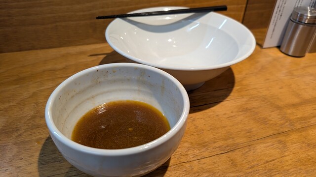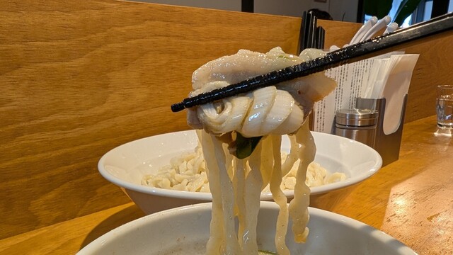 純手揉み中華 れん の辛ネギ豚つけ麺、美味しかったです。お店の監修者はミシュランガイド東京のビブグルマンを6年連続で受賞した「らぁ麺やまぐち」店主の山口裕史さんです。山口さんは辛いもの好きでも有名な方です。その山口さんが考案した辛ネギ豚つけ麺のつけ汁は、最初に煮干しがふんわり香り、丸鶏特有のふくよかな旨味と豚骨と豚肉の旨味が口の中に広がる絶品つけ汁です。後から控えめに辛さを感じます。注文が入ってから一杯一杯雪平鍋でつけ汁を温め、生の豚肉を加えて豚の脂の旨さと芳醇な醤油の香りを引き出す演出は流石です。麺は福島市の製麺所である羽田製麺の多加水太ちぢれ麺で、「夏黄金」という小麦と「もち小麦」をブレンドした特注麺です。麺をゆでる前に手揉みを加えることで、麺の太さがランダムになり麺をすするたびに違う食感が味わえます。しかも、冷水で締めるため、さらにコシが強くなり麺の噛み応えもバツグンです。冬場は水道水の温度もさらに低くなるため、さらにコシが強くなります。麺の長さも普通より長めですすりがいがあります。つけ汁の中の刻まれたチャーシューとネギ、フワフワ食感の豚肉との組み合わせは最強です。辛ネギ豚つけ麺とネギ豚つけ麺は平日限定でしたが休日も提供されるようになりました。純手揉み中華 れん の辛ネギ豚つけ麺、おすすめです。