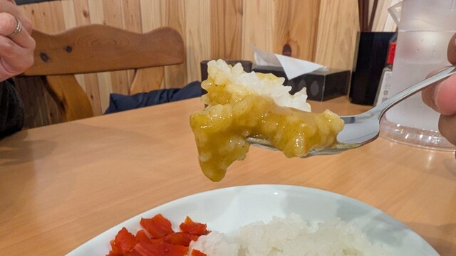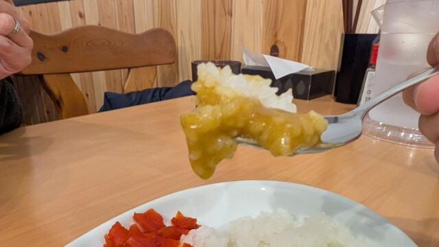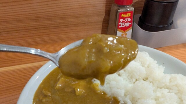 ベースストックは意外にも豚骨スープ系の動物性旨味を感じさせ、コラーゲン質の粘弾性とラード的脂質のラウンド感が、カレー粉の角張ったスパイスエッジを巧みにラッピング。そこに長時間ソテー由来のメイラード的タマネギの甘味が前駆し、後段から豚肉のグルタミン酸・イノシン酸の二重奏が追撃してくる旨味レイヤリング構成です。