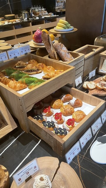 翌朝7時半頃にモーニング。パンとオムレツ、フルーツを食べました。パンのレベルが高くてどれを選んでも本当に美味しい!食後にはクロッフルも注文してキャラメルソースをかけていただきました。