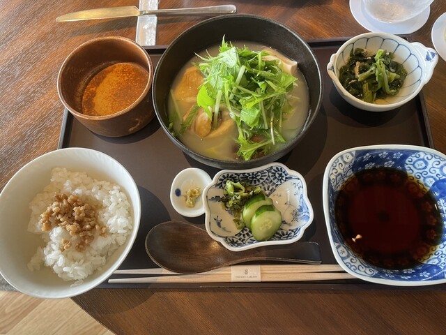 12時にチェックアウトしてランチは日替わりの水炊き定食を注文。他にも軽食のフルーツサラダを食べました。ホタテやエビといちじくがのっていてめちゃくちゃ好みでした!